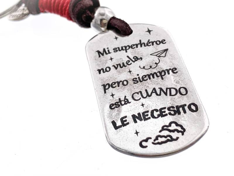 Llavero con la frase “Mi superhéroe no vuela pero siempre está cuando le necesito”. Es un regalo ideal para regalar a papá, el día del padre, cumple, nacimiento… Le encantará! No olvides dedicarlo por el revés con una frase.